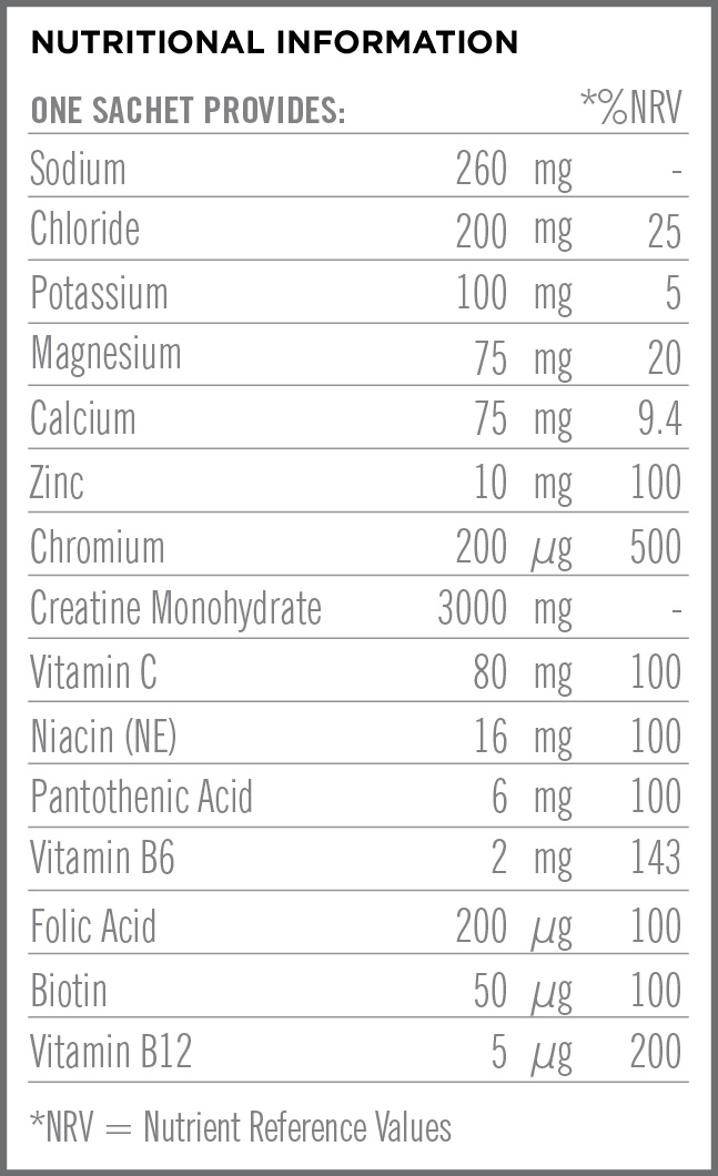 Creatine monohydrate; sodium bicarbonate; calcium lactate; magnesium salts of citric acid; acidity regulator: citric acid; potassium chloride;