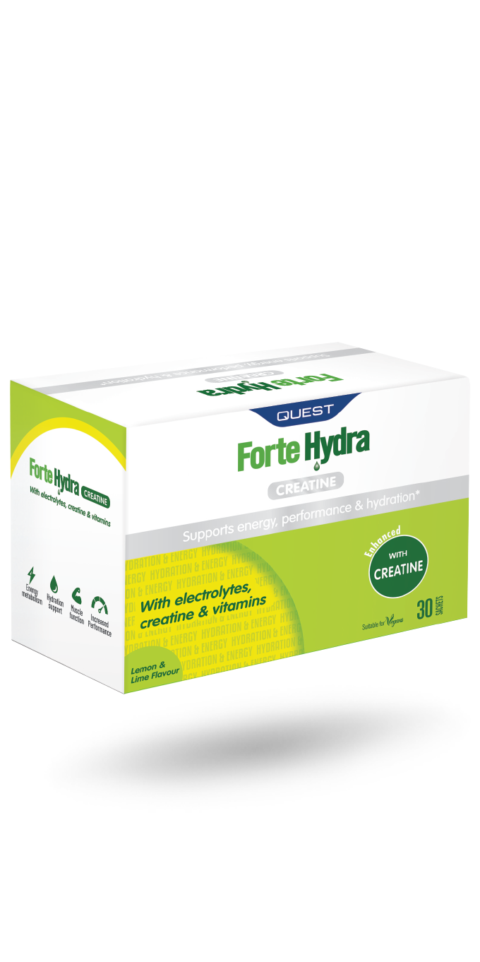 Forte Hydra Creatine is an oral hydration solution formulated with electrolytes, creatine, and essential vitamins to support hydration, muscle function, energy metabolism, and physical performance. It contains sodium and chloride to help maintain water-electrolyte balance, while potassium, calcium, and magnesium contribute to normal muscle function. Magnesium, Vitamin C, Vitamin B12, Niacin, Folic Acid, and Biotin contribute to normal energy-yielding metabolism and help reduce tiredness and fatigue. Several of these nutrients also support normal psychological and nervous system function. Creatine enhances physical performance in successive bursts of short-term, high-intensity exercise.